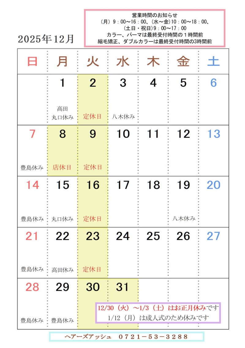 年末年始の休みは12月30日から1月3日までです。